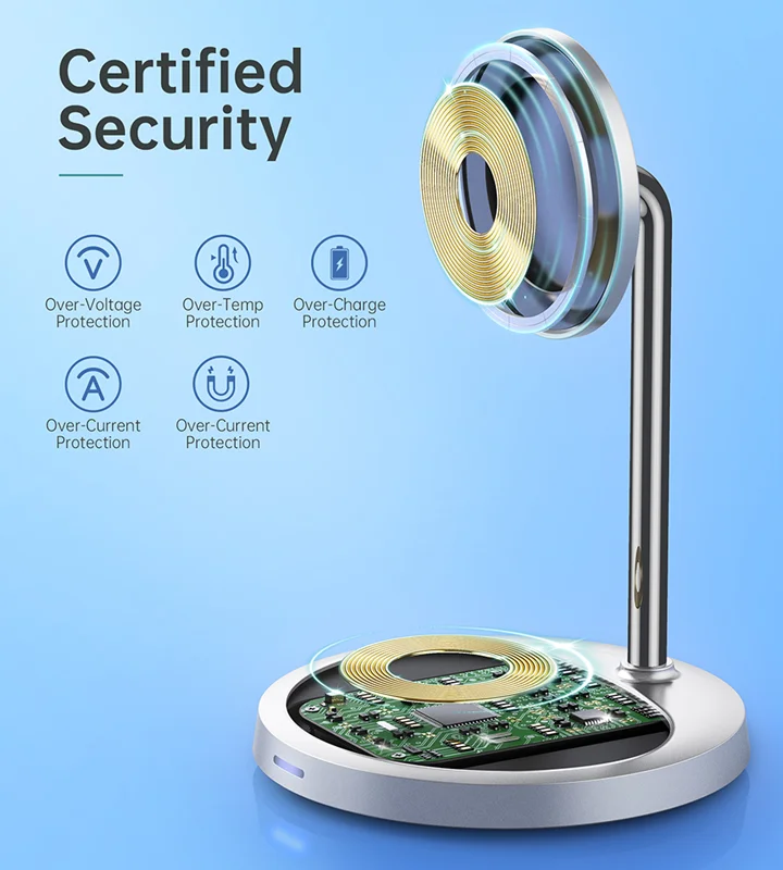 چراغ های LED منحصر به فرد وضعیت شارژ تلفن هوشمند و هدفون را به طور همزمان نشان می دهد. دارای گواهینامه تراشه هوشمند Qi & ETL شارژر بی سیم magsafe است که از شارژ بیش از حد ، گرم شدن بیش از حد و اتصال کوتاه جلوگیری می کند و محیط شارژ ایمن و مطمئن را فراهم می کند.