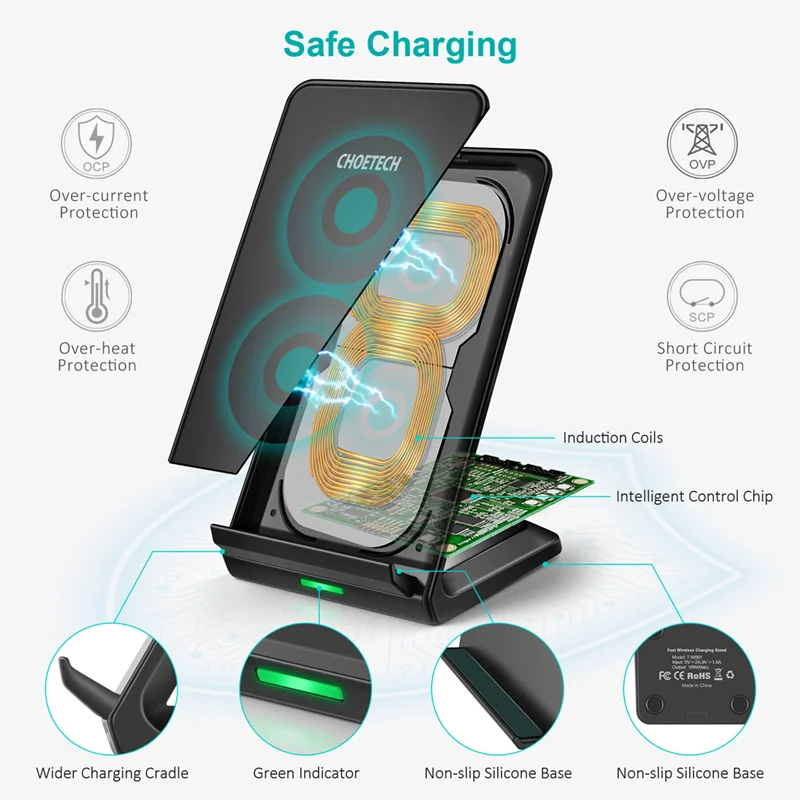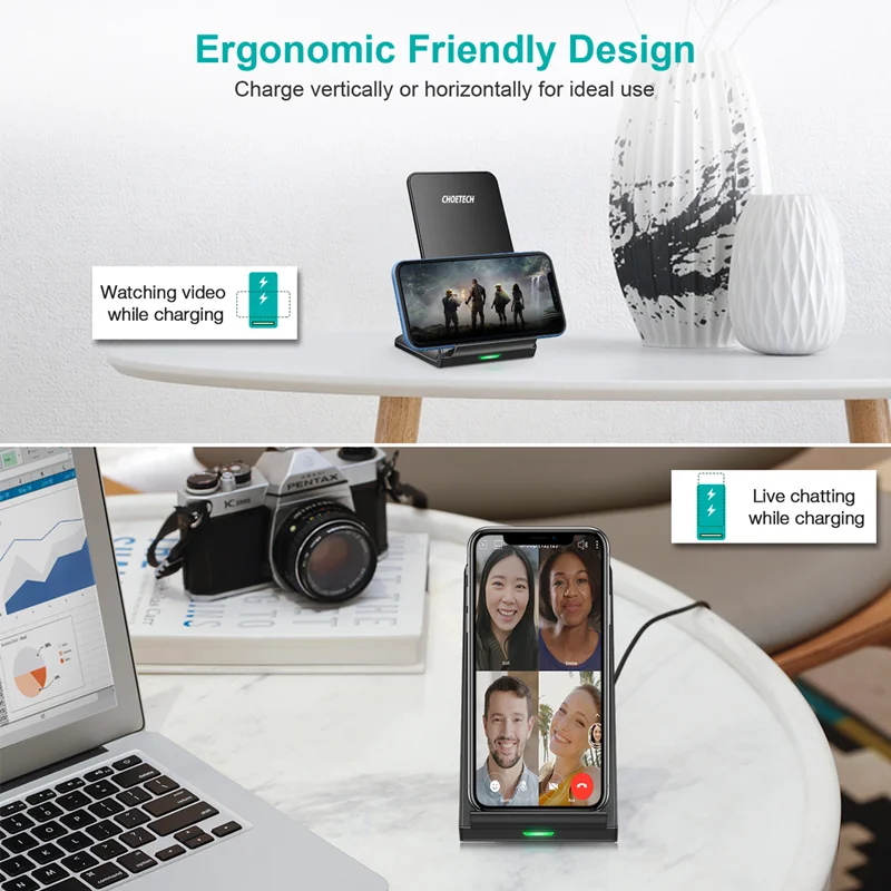 پایه شارژر بی سیم CHOETECH تضمین می کند که به سرعت به صورت عمودی یا افقی با قابلیت Qi دستگاه شما را شارژ می کند.