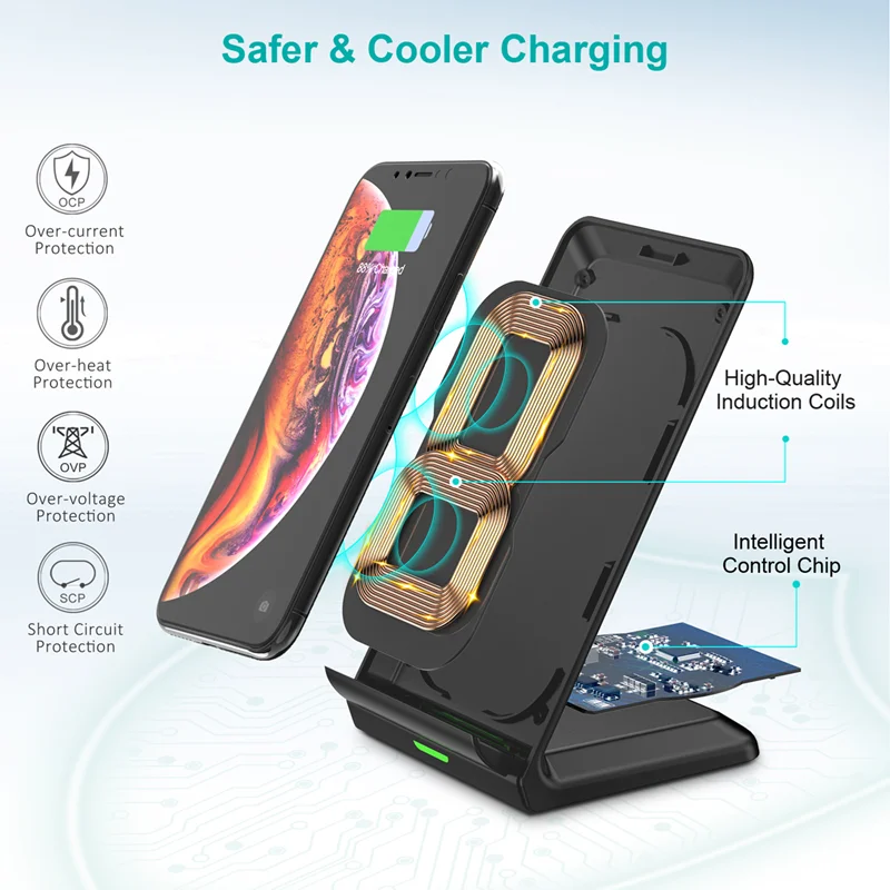 تراشه هوشمند یکپارچه داخل شارژر بیسیم امکان کنترل بهتر دما ، محافظت در برابر ولتاژ بیش از حد ، جلوگیری از اتصال کوتاه ، گرم شدن بیش از حد، جلوگیری از جریان بیش از حد و موارد دیگر را فراهم کرده است . شارژر بی سیم Qi یک محیط شارژ ایمن را به شما می دهد.