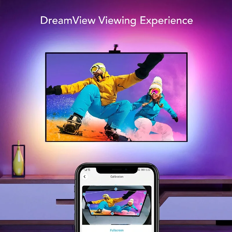 دوربین را می توان به بالای مرکز تلویزیون شما متصل کرد. با گیره ها و چسب ها، نور پس زمینه تلویزیون 12.5 FT که از 4 قطعه تشکیل شده است را می توان به طور محکم در هر 4 طرف هر 55-65 تلویزیون نصب کرد. هر طرف از طریق یک کابل انعطاف پذیر متصل می شود.