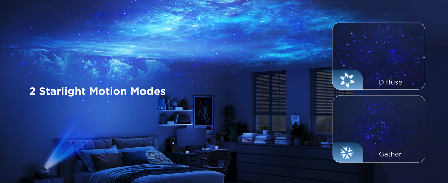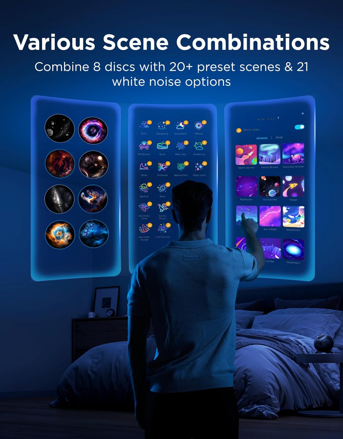 این پروژکتور ستاره گلکسی با ۸ دیسک، بیش از ۲۰ صحنه و بیش از ۲۱ گزینه نویز سفید ارائه میهد - به شما این امکان میدهد تجربیات خود را سفارشی کنید.