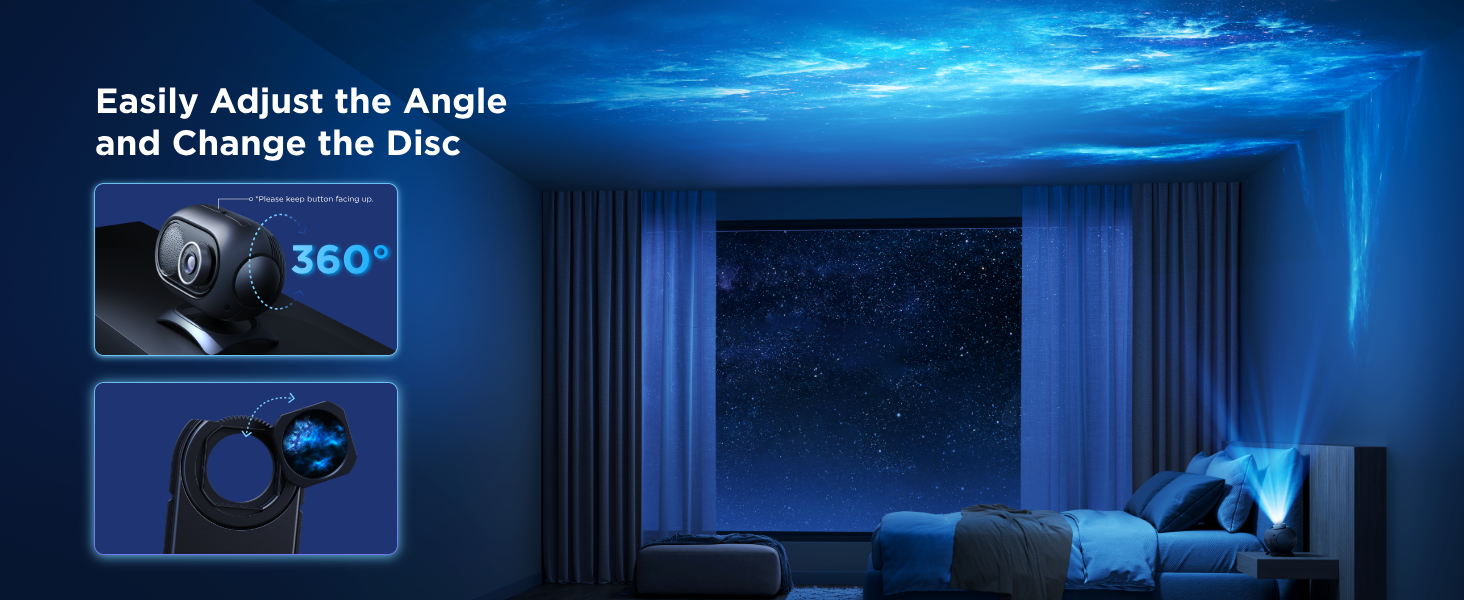 این پروژکتور نور ستارهای امکان تنظیم ۳۶۰ درجه را برای مشاهده از هر موقعیتی فراهم میکند و بچهها میتوانند به راحتی دیسکهای فیلم را تعویض کنند. این پروژکتور نور فضایی شامل یک تایمر خاموش شدن خودکار ۲ ساعته برای راحتی و صرفهجویی در مصرف انرژی است.