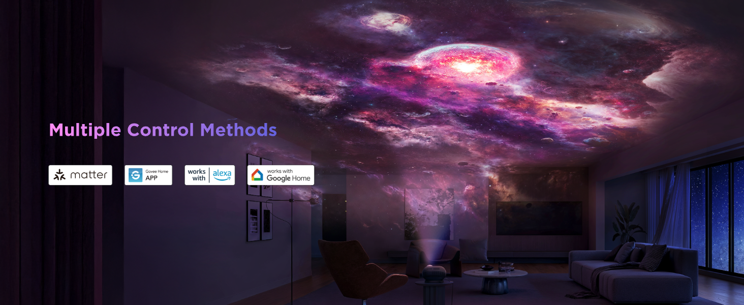 این پروژکتور نور ستارهای govee با Matter، Alexa یا Google Assistant کار میکند. برای دسترسی از راه دور از برنامه Govee Home استفاده کنید. حداکثر ۶ صحنه نورپردازی دلخواه را در برنامه Govee سفارشی کنید و آن صحنهها را برای تغییرات تک لمسی در دکمه فیزیکی این پروژکتور آسمان شب ذخیره کنید.