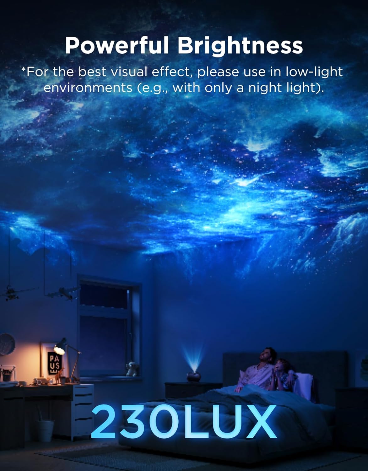 با روشنایی ۲۳۰ لوکس، این پروژکتور آسماننما حتی در شرایط کمنور، نقشه ستارهای واضحی را ارائه میدهد. میتوانید کیهان را بدون خاموش کردن همه چراغها کاوش کنید.