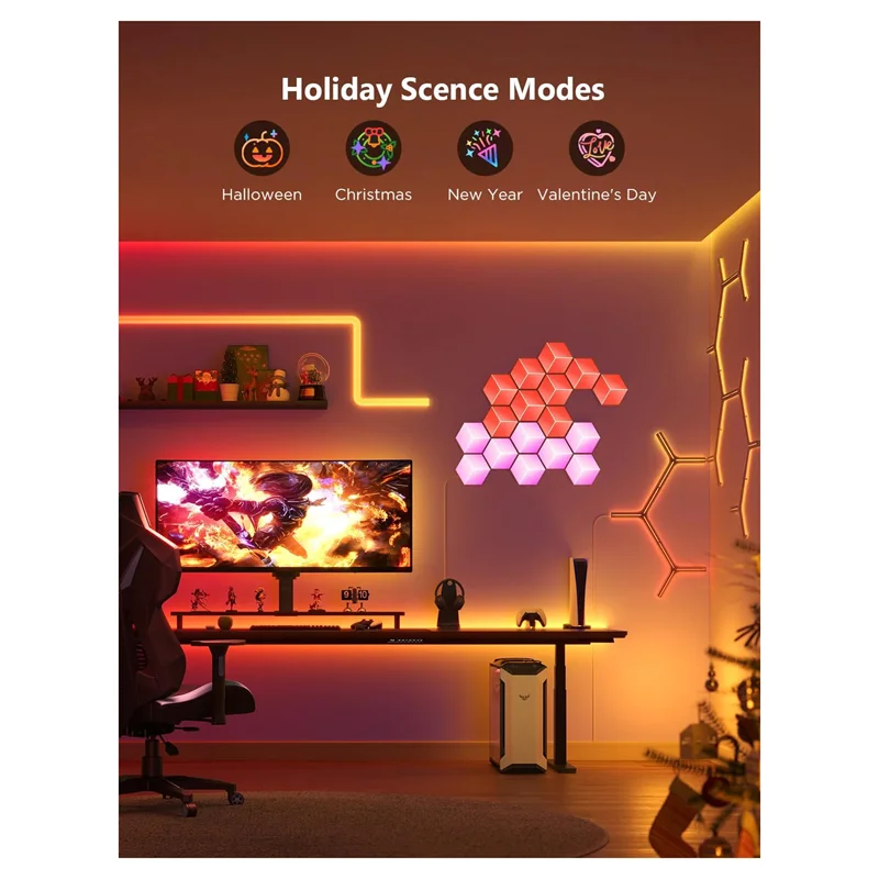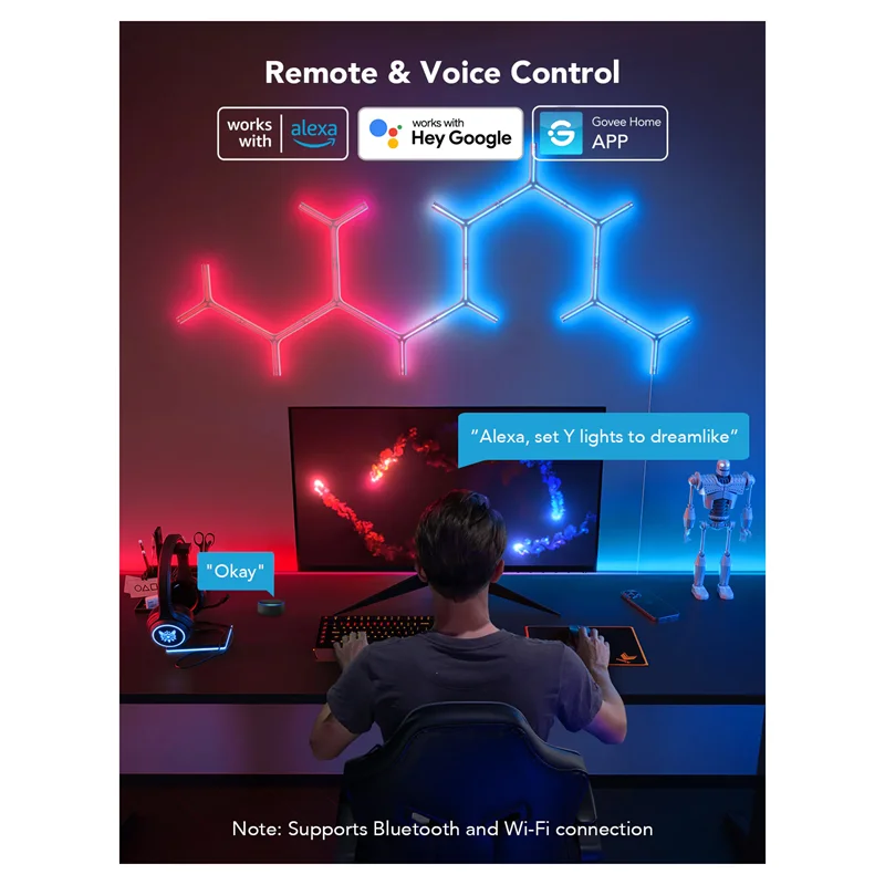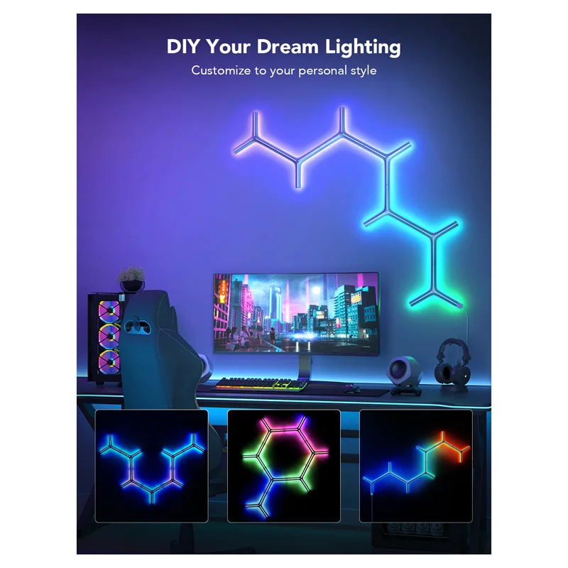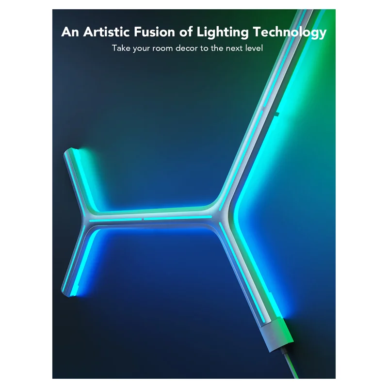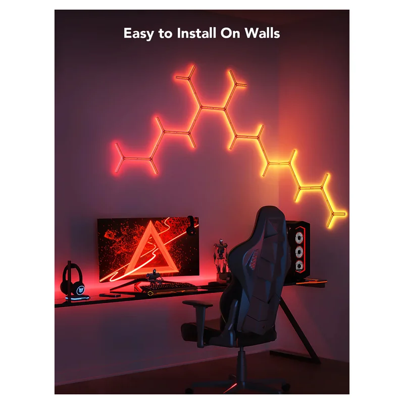 با فناوری RGBIC Govee، هر لبه میتواند رنگهای نور متفاوتی را برای ایجاد جلوههای نوری منحصر به فرد بین پانلهای دیوار نشان دهد.