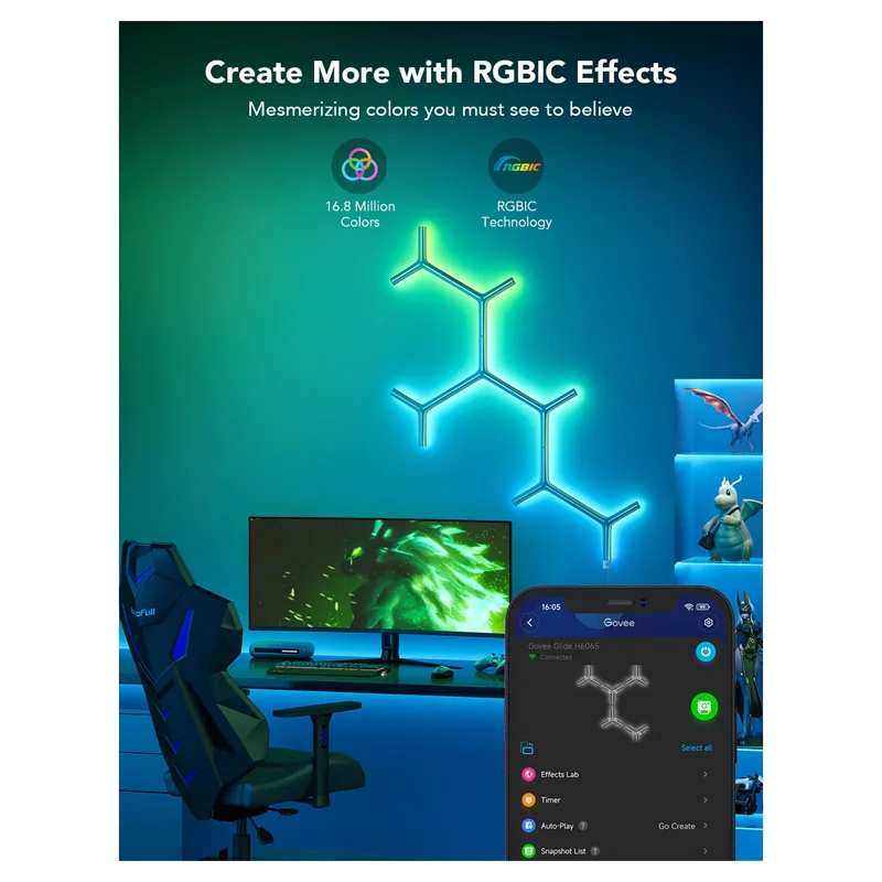 اتاق خود را با ویژگی DIY ما در برنامه Govee Home تغییر دهید. با 16.8 میلیون گزینه رنگ، جلوه های نوری را متناسب با دکوراسیون اتاق بازی شما طراحی کنید. دیوارهای خود را با رنگ های خاص تزئین کنید که شادی بیشتری را به زندگی شما اضافه می کند.