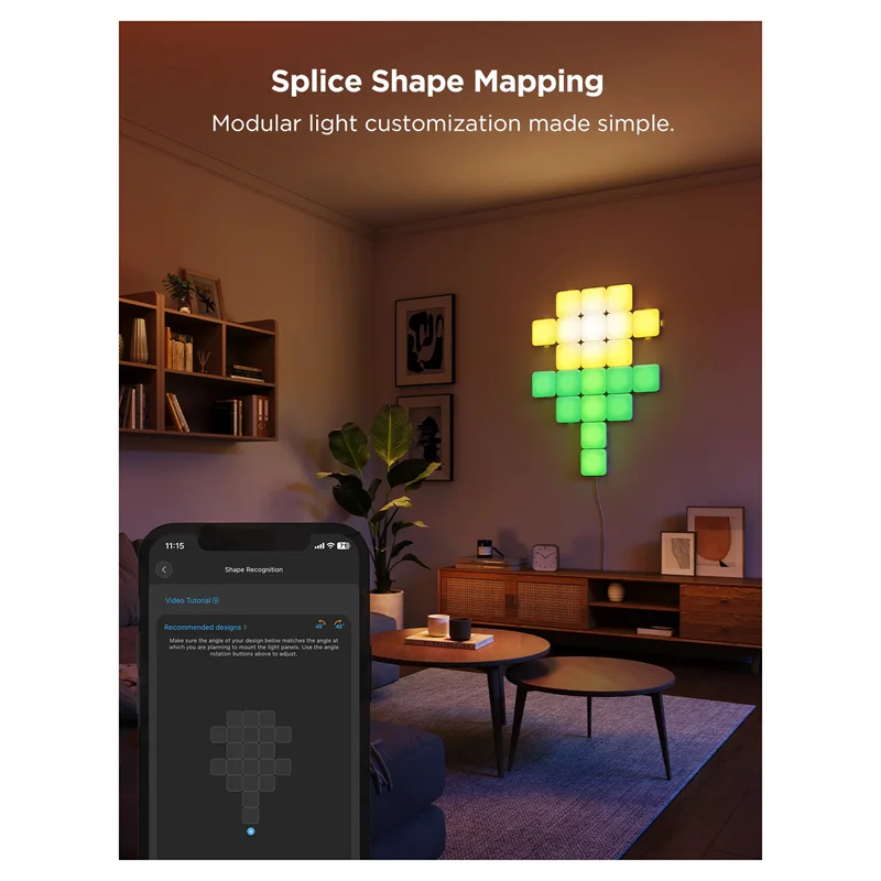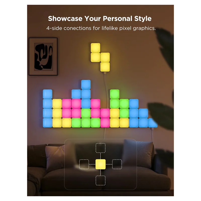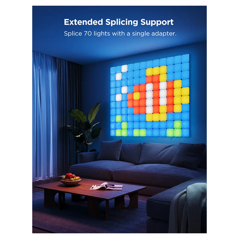 یک آداپتور برق می تواند تا 70 چراغ دیواری هوشمند مکعبی را متصل کند. از طریق برنامه Govee Home، می توانید هر پانل نور را برای دستیابی به جلوه های هنری پیکسل شخصی سازی کنید.