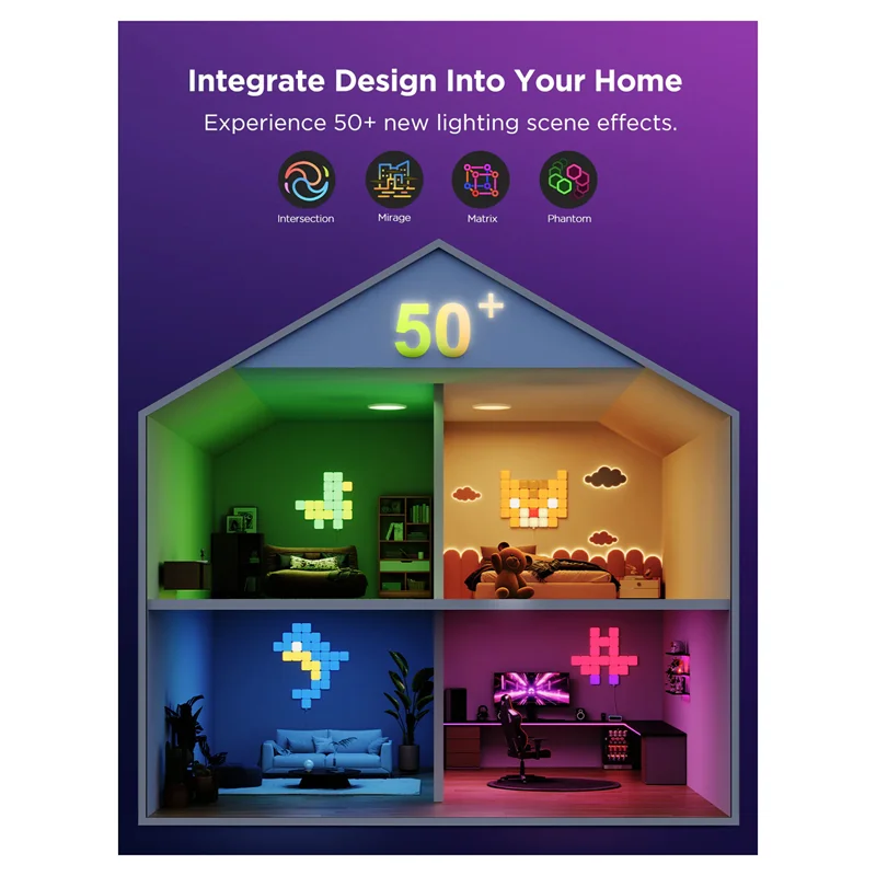 بیش از 50 افکت نور صحنه جدید و حالت های همگام سازی موسیقی موجود است. این چراغ های پنل ال ای دی را می توان به طور کامل در اتاق خواب، اتاق نشیمن، اتاق کودک، اتاق بازی و غیره ادغام کرد.