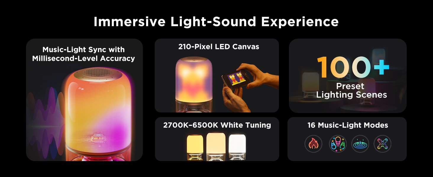 با ۱۶ حالت نورپردازی پویا و واکنشپذیر به موسیقی، تنها در ۳۲ میلیثانیه با صدا همگام میشود.