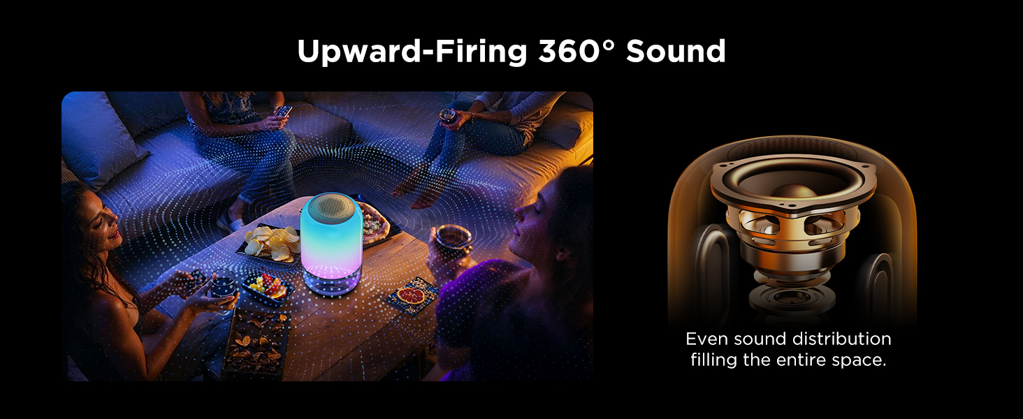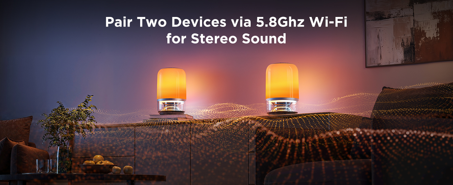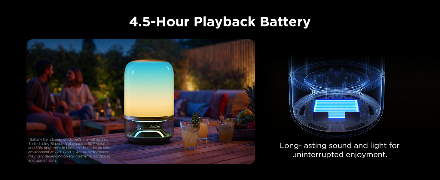 باتری ۵۲۰۰ میلیآمپر ساعتی موجود در این چراغ رومیزی بیسیم هوشمند، از ۴.۵ ساعت پخش همزمان صدا و نور با میزان صدا و روشنایی ۵۰٪ پشتیبانی میکند و مهمانی شما را در تمام طول شب بدون وقفه ادامه میدهد.