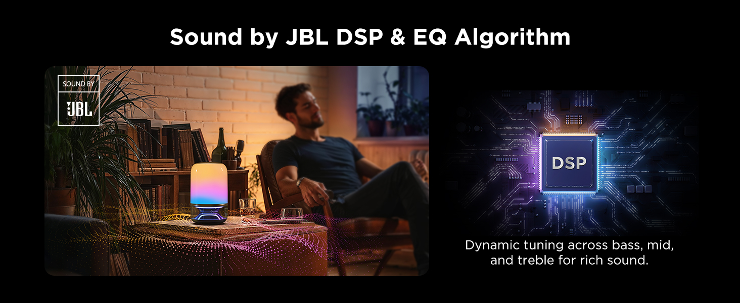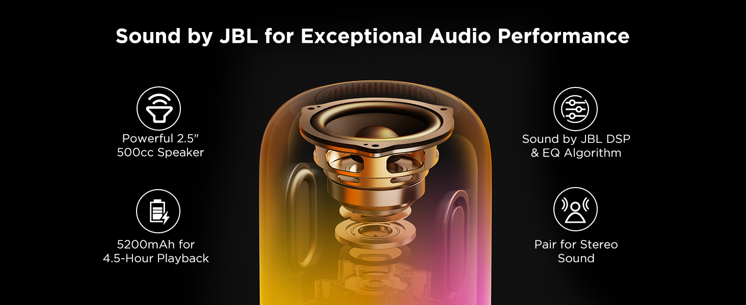 با یک بلندگوی جمع و جور 2.5 اینچی 500 سیسی با برد کامل، با الگوریتم اکولایزر Sound توسط JBL، یک تجربه صوتی عالی را ارائه میدهد. دو چراغ رومیزی را برای صدای استریو فراگیر و جلوههای نوری هماهنگ جفت کنید.