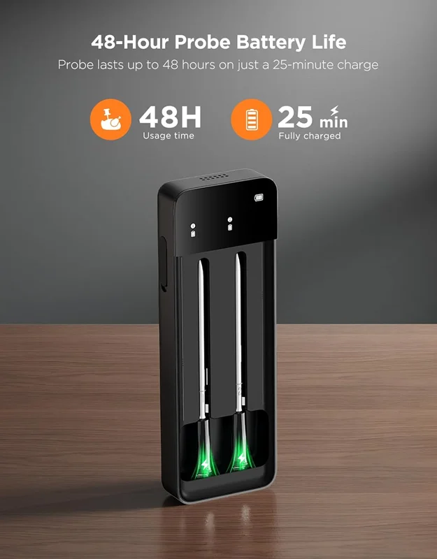 این دماسنج گوشت دیجیتال دارای یک صفحه نمایش LCD 10 منظوره با ردیابی دما است. این کاوشگر در 25 دقیقه به طور کامل شارژ میشود و 48 ساعت استفاده مداوم را ارائه میدهد. پایه مغناطیسی داخلی آن فوراً روی گریلها، کبابپزها، باربیکیوها و سطوح پخت و پز قفل میشود تا بدون دخالت دست بتوانید بر آن نظارت داشته باشید.