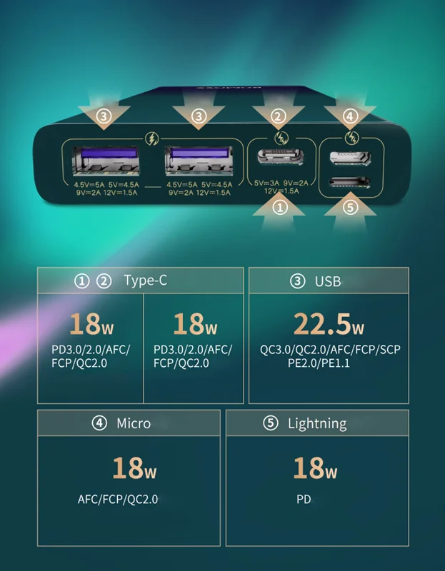 پنج پورت در بالا ملاحظه می کنید که پورت Type C با هر دو عملکرد ورودی و خروجی وجود دارد. سه ورودی و سه خروجی وجود دارد. طبق آزمایش ، همه آنها از شارژ سریع پشتیبانی می کنند. مشخصات شارژ مربوطه نیز در زیر هر رابط مشخص شده است.